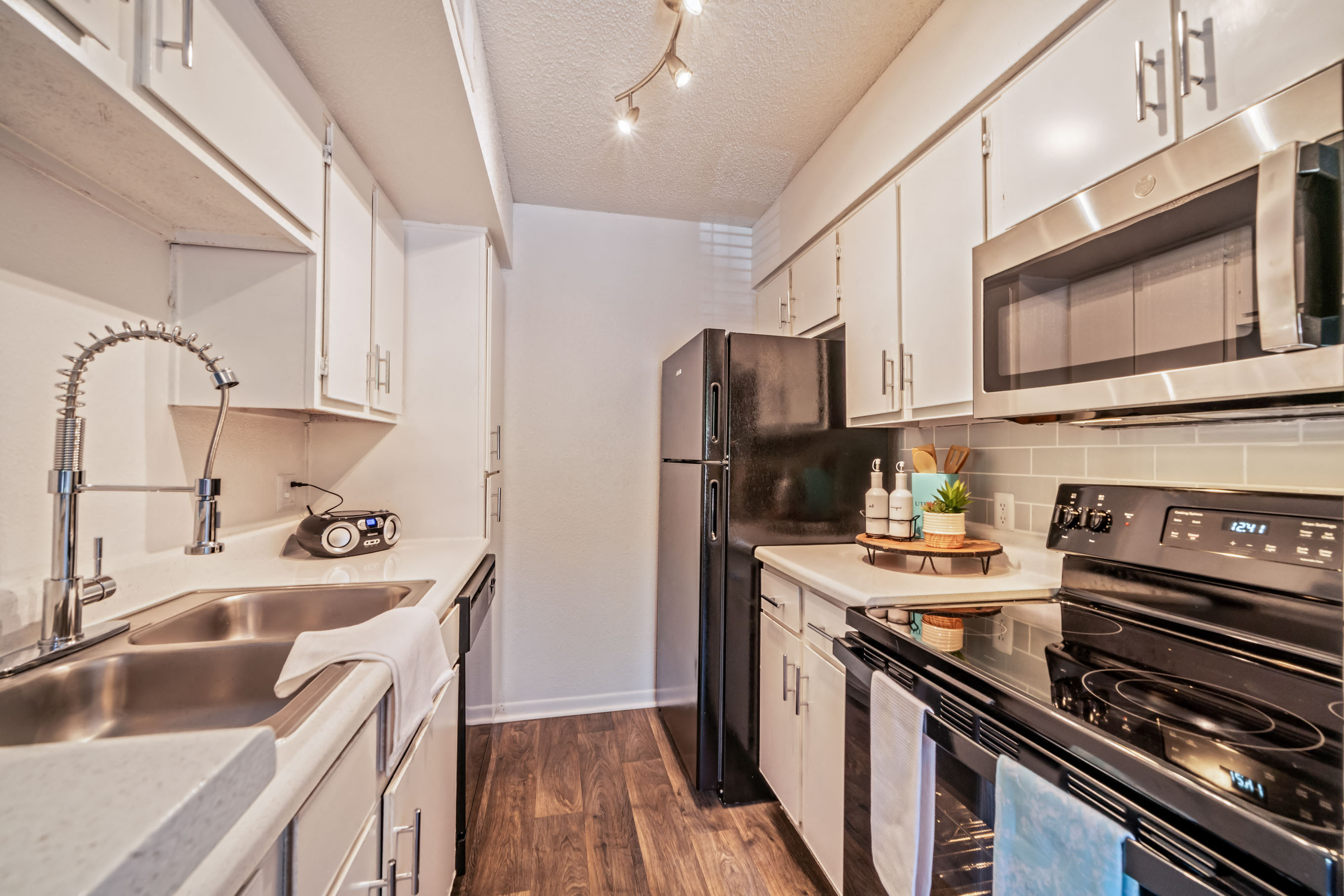 2 Bed 2 Bath 925 sqft. 2 Bed 2 Bath 892 sqft. Stainless steel appliances quartz countertops full-sized 42 cabinets wood plank flooring in kitchen and living.